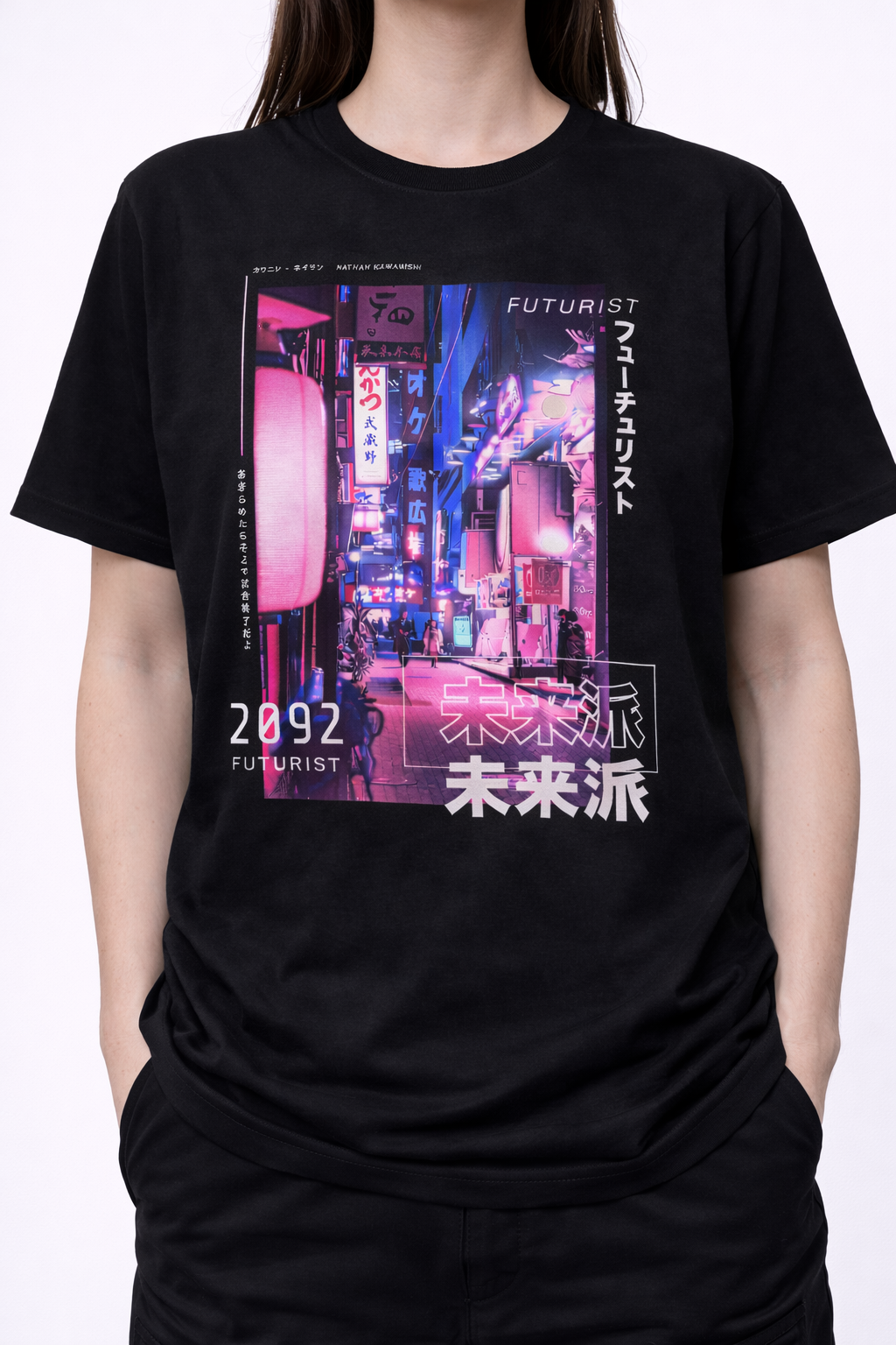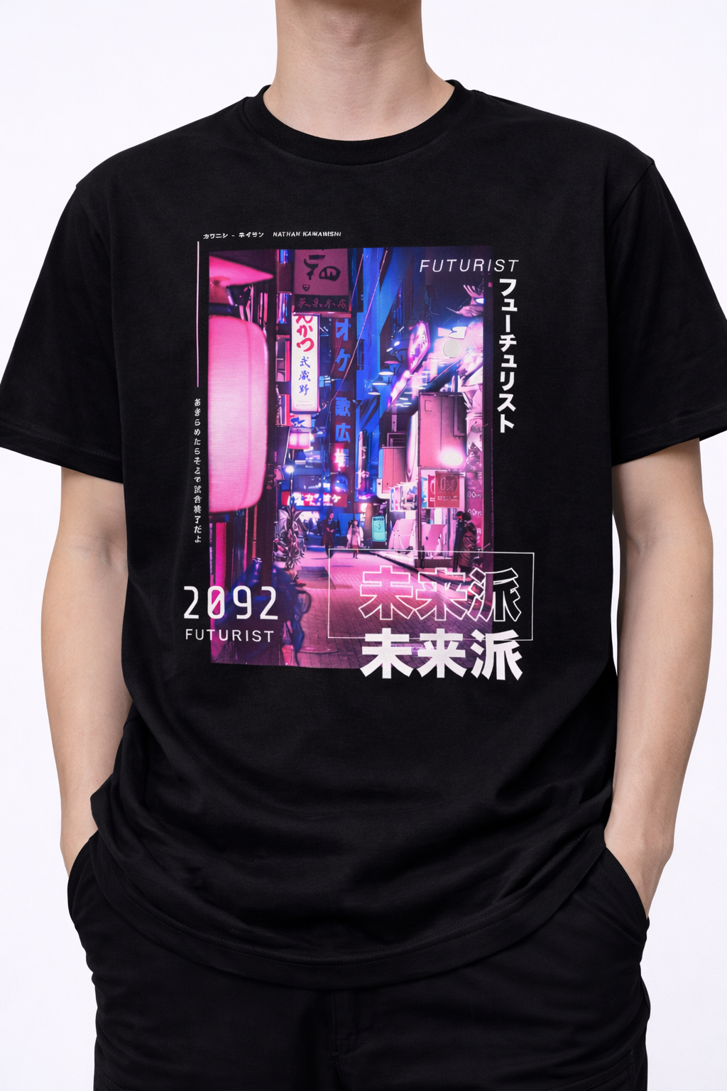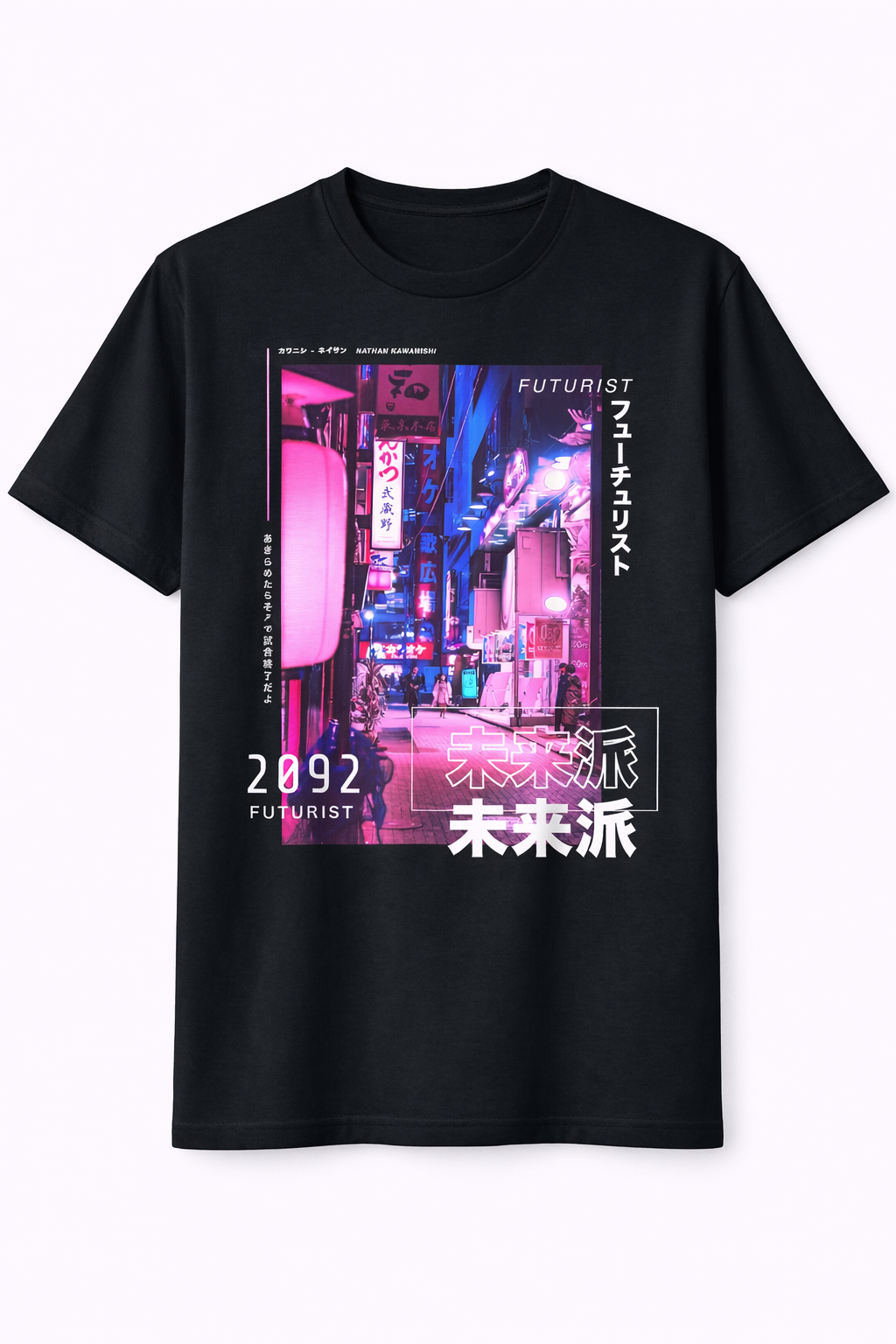 Step into a Neon-Drenched Future Embrace the high-energy aesthetic of tomorrow with our “Futurist 2092 Cyber Tokyo” Tee. This original graphic design features a vibrant, multi-layered composition of a futuristic urban district bathed in neon pink and electric blue lighting. With bold typography, digital “2092” markers, and Japanese Kanji accents, this shirt is a definitive statement piece for fans of synthwave, neo-noir cyberpunk culture, and modern streetwear.
