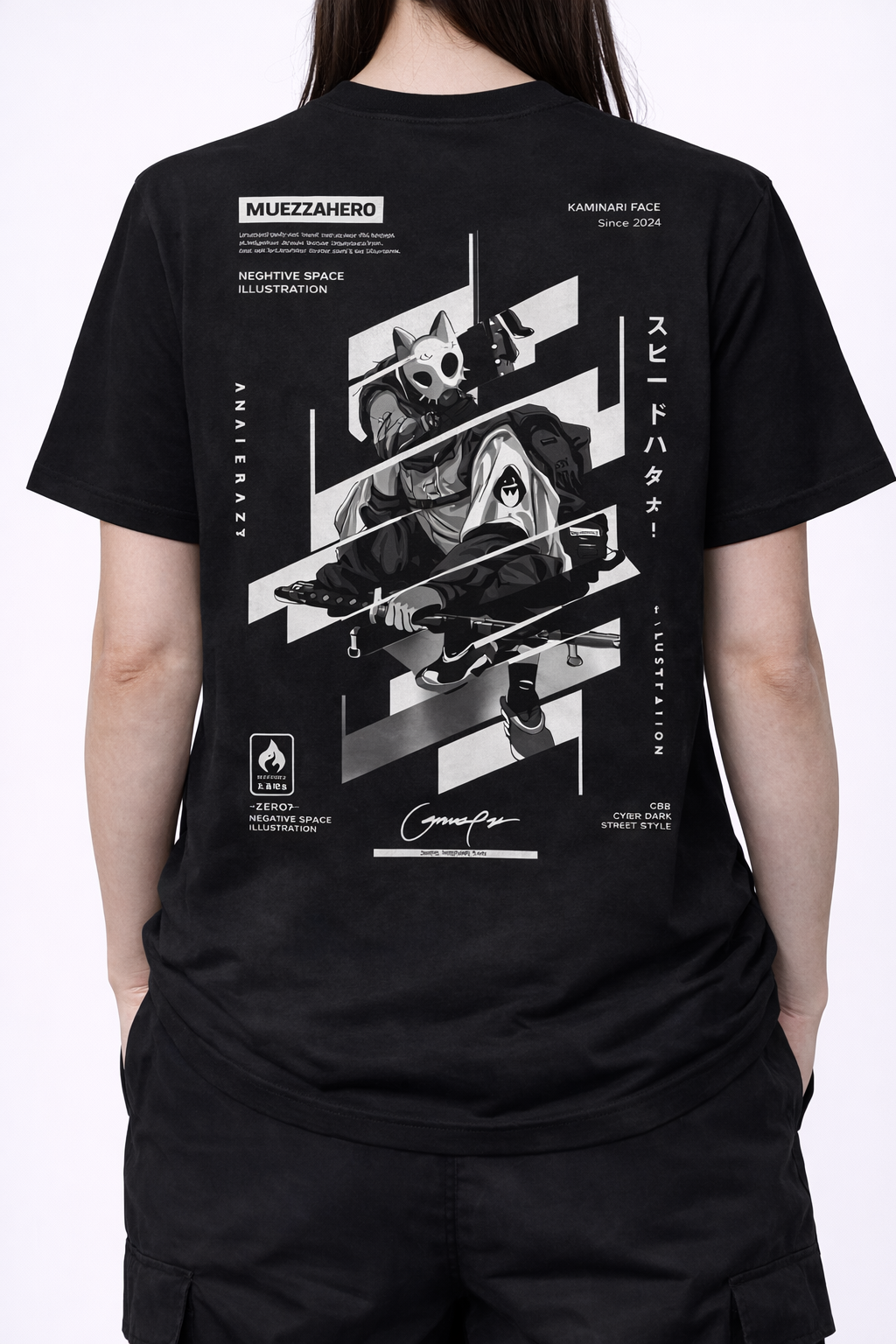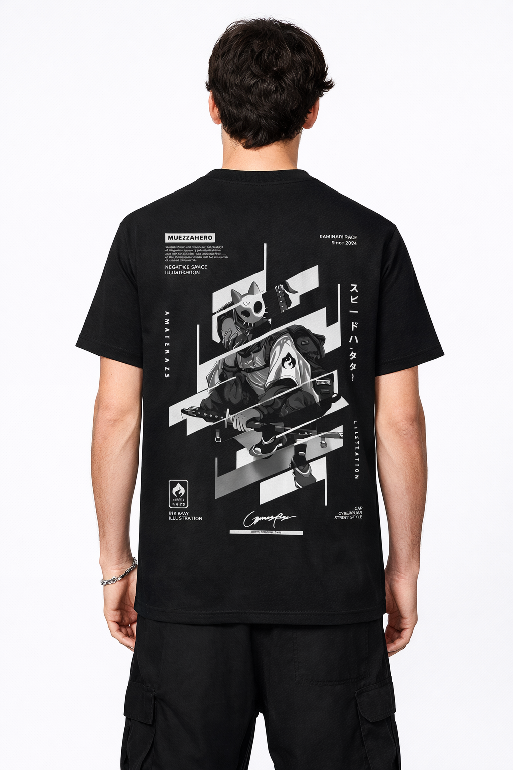Unleash the Spirit of the Speed Hunter Elevate your urban wardrobe with the “Kaminari Race Speed Hunter” Tee. This high-impact graphic design features a masked urban warrior aesthetic, blending tech-wear elements with traditional ink-style illustration. With bold diagonal framing, stylized Japanese typography, and a “Cyberpunk Street Style” theme, this tee is a standout piece for fans of futuristic subcultures and high-contrast graphic art.