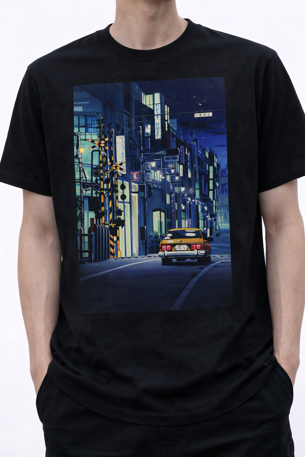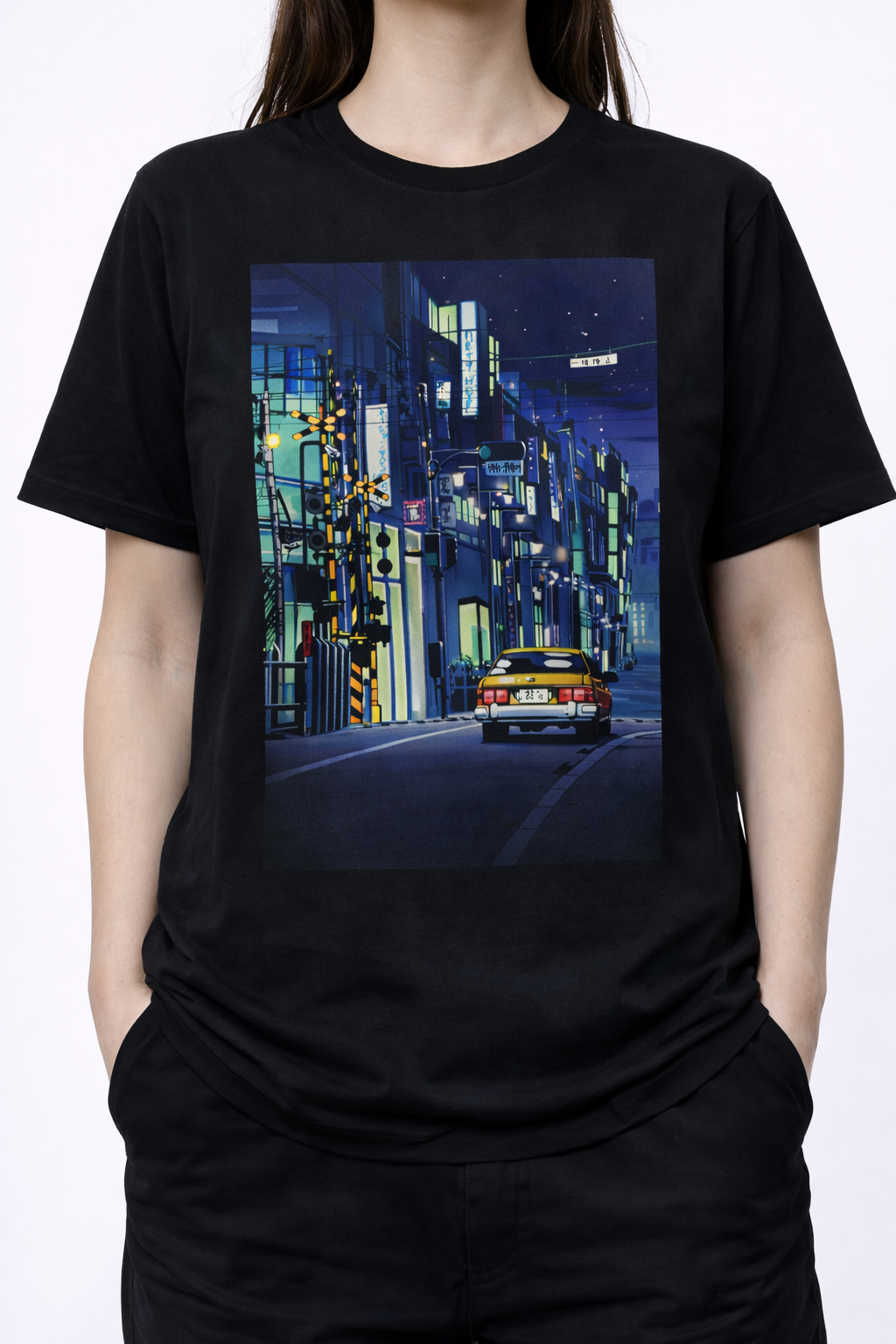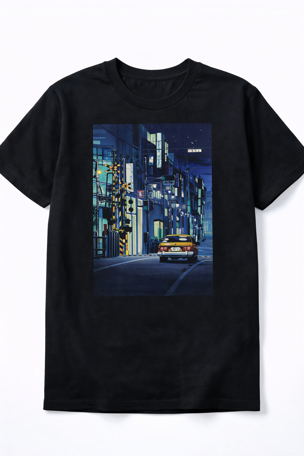 Embrace the Vibe of the City at Night Experience the aesthetic of a midnight cruise through the neon-lit streets of Japan with our “Tokyo Night Ride” Tee. This original graphic design captures a lo-fi, retro-anime inspired scene featuring a classic car navigating a quiet urban alleyway. Perfect for fans of city pop aesthetics and urban streetwear.